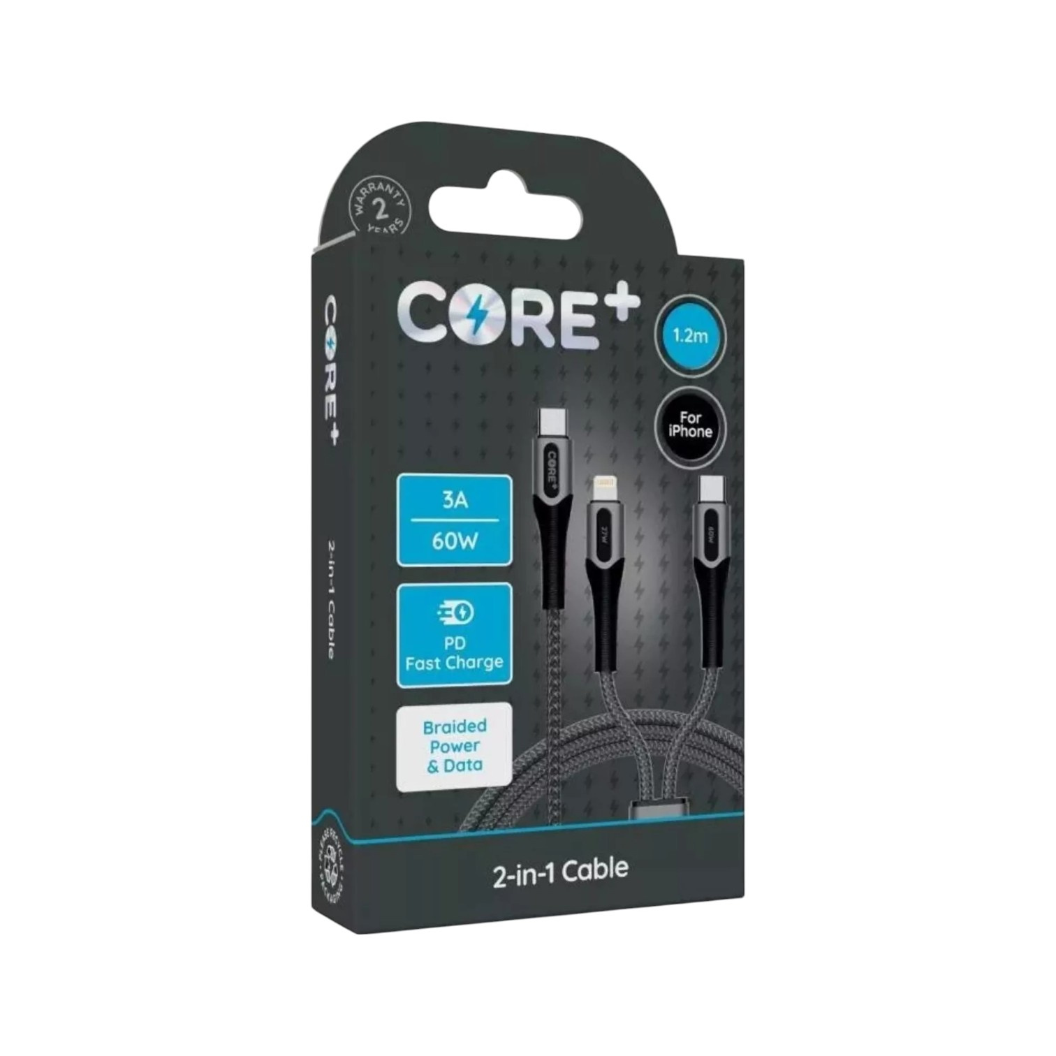 Core Plus 2-in-1 Cable 1.2m Braided Black TPE White 3A/60W.5W
