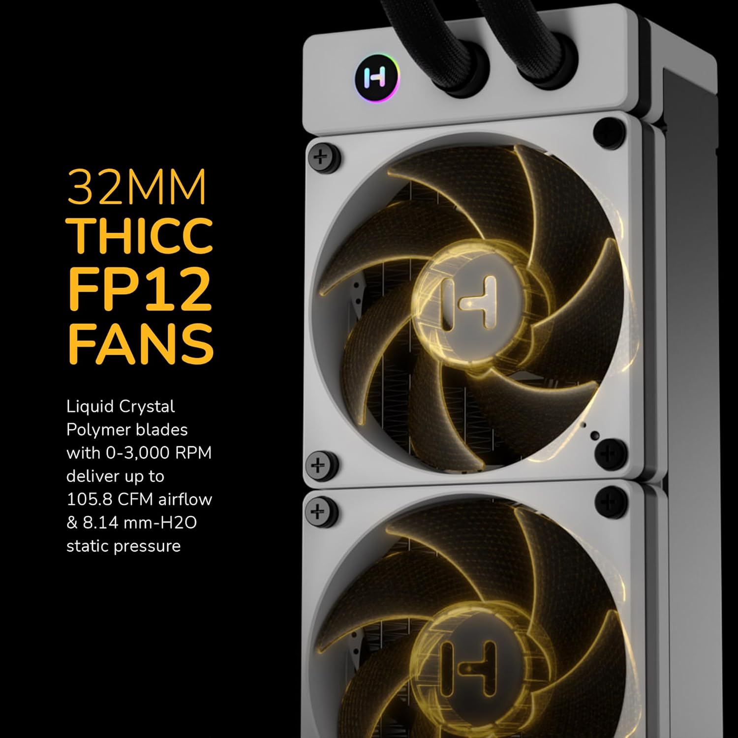 The HYTE THICC Q60 is a next-generation 240mm AIO liquid CPU cooler that fuses premium aesthetics with high-performance engineering. At the heart of this cooler is a 5-inch 720×1280 IPS display that provides real-time system monitoring, media playback, or custom graphics—all customizable via HYTE’s Nexus software suite. Designed with a robust 52mm-thick aluminum radiator, the Q60 offers significantly improved thermal dissipation over conventional AIOs. Paired with two ultra-performance THICC FP12 fans, it delivers exceptional airflow and static pressure while maintaining relatively quiet operation.